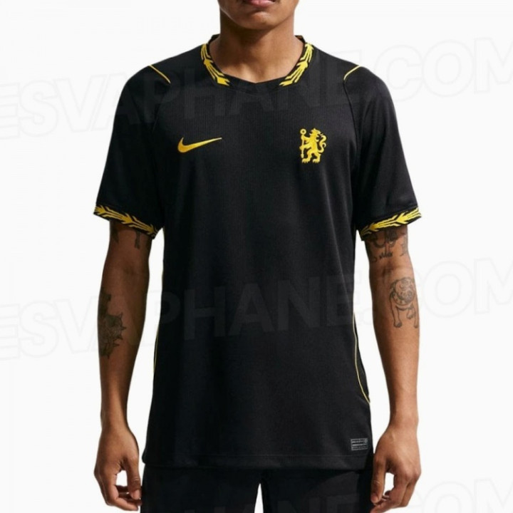 切尔西2026-27赛季客场球衣由耐克打算坐蓐,球衣遴荐了从简而当代的好意思学作风,以纯玄色为底色,衣身部分莫得任何布景图案、纹理或流畅性的图形,领口和袖口成为打算亮点。