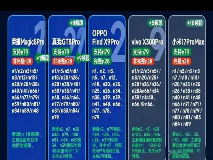 7.n28频段成要害。vivo X300 Pro在山区实测中,n28信号强度比缺失时型高5dBm,下载速度踏委果80Mbps;小米17 Pro Max因n28完好意思,4K视频加载无延伸。