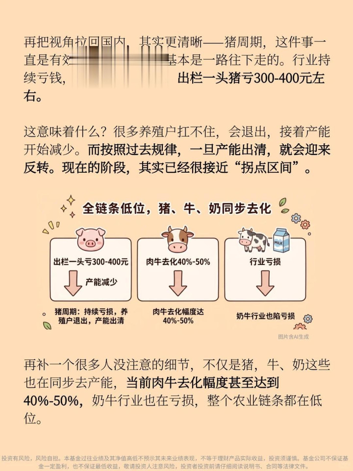 有东说念主可能会说,此次不一样。但数据不会骗东说念主:不仅仅养猪的扛不住了,肉牛行业去化幅度致使达到了40%-50%,奶牛行业不异深陷吃亏。不错说,统共农业衍生链条,的确齐在同步“去产能”。当众人齐扛不住,启动减少衍生量的时分,市集上的肉就会迟缓变少,价钱当然就会触底反弹。