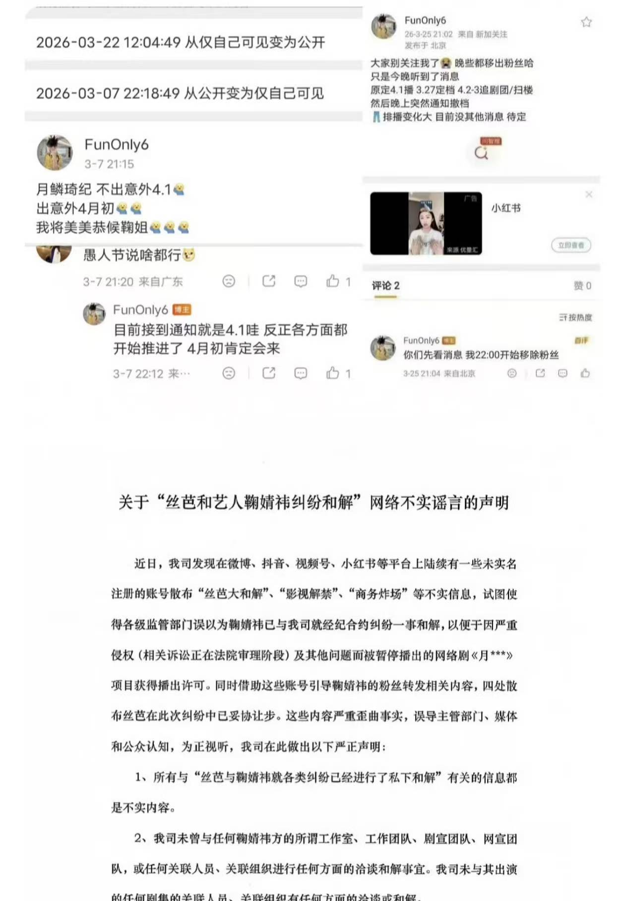先是有瓜主爆料《月鳞绮纪》定档的音信,自后这位瓜主又爆料撤档的音信,当今主演鞠婧祎的公司丝芭传媒又发表声明,示意与鞠婧祎莫得罢了妥协。