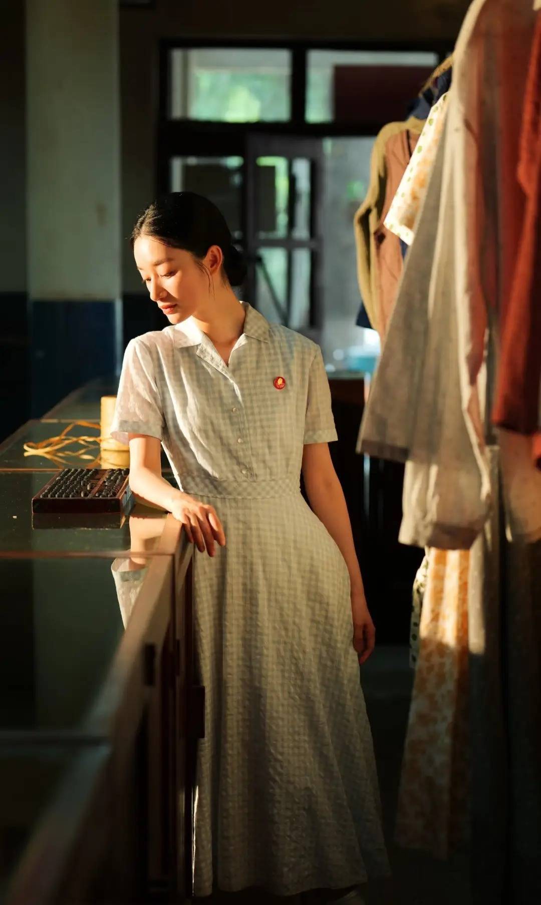 浅蓝白格纹翻领连衣裙,收腰 + 中长裙摆,把80年代的优雅感拉满,格纹比纯色更有相沿氛围,浅蓝调在暖光下显得非常暖热。