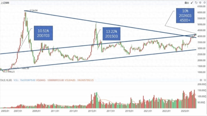 最近全球省略率齐被指数绕得蒙头转向:明明前期走势还算持重,一霎启动回调,围绕3800多点反复震憾,有东说念主慌着割肉,有东说念主等着抄底,还有东说念主拿着握仓害怕不安,不知说念这波转机是行情适度,也曾良晌蓄力。其实根底毋庸瞎猜,A股有一条十几年的中枢趋势线,能径直定中弥远牛熊,等于把2007年的历史高点6124点,和2015年的牛市高点5178点连起来的那条线。这条弥远下降趋势线在本月恰恰运行到3850点的位置,近期的回调,实质等于指数冲破弥远压力后,对这条关键趋势线相沿力度的回踩阐发。