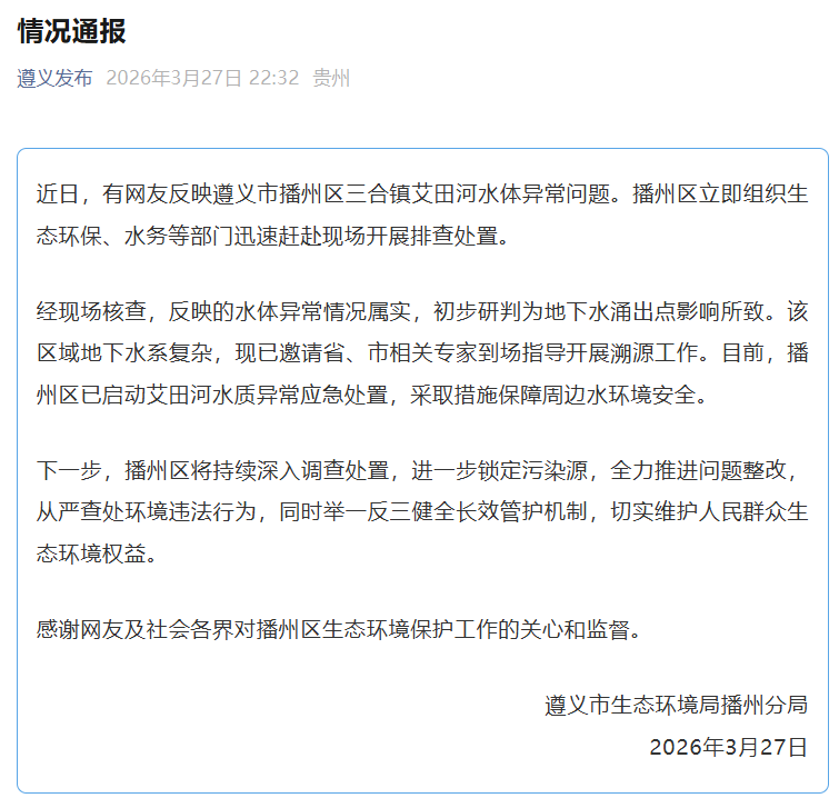 IM体育官方网站首页 网友反馈遵义市播州区三合镇艾田河水体相称,官方通报:情况属实,初步研判为地下水涌出点影响所致