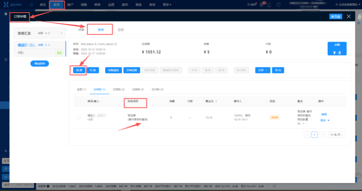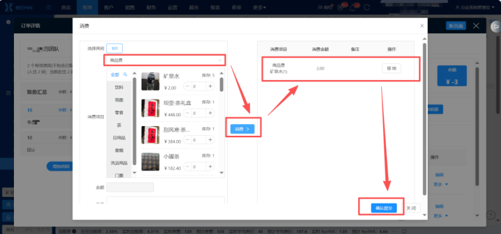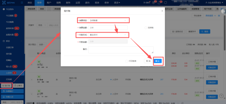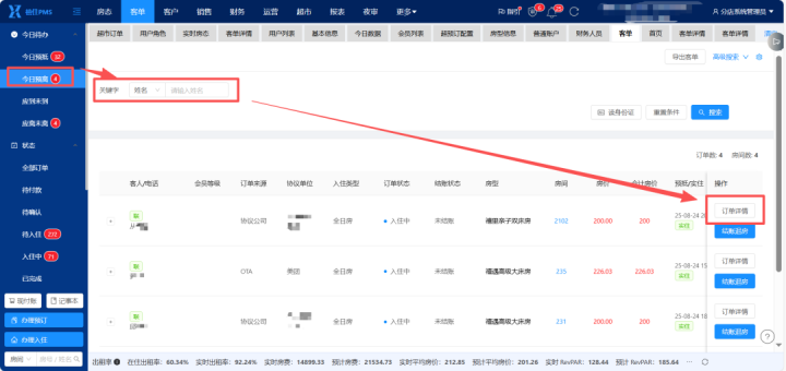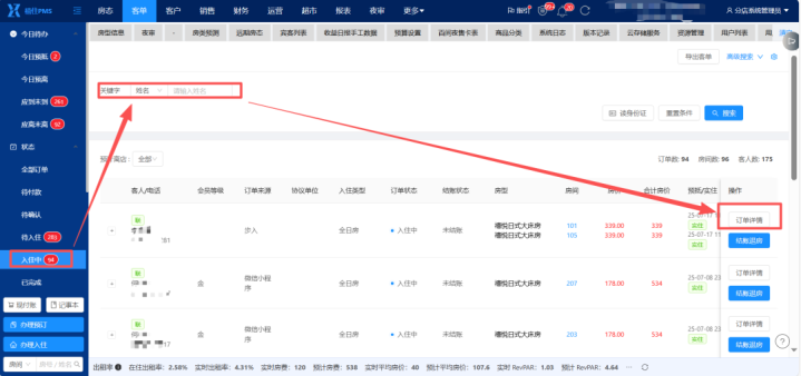PMS首页--客单--入住中--输入关节字搜索订单--掀开对应订单订单笃定
