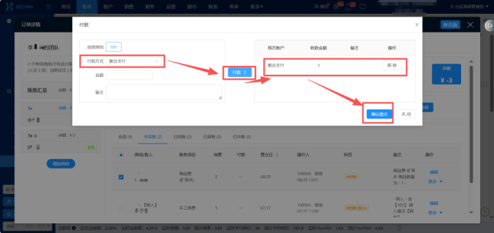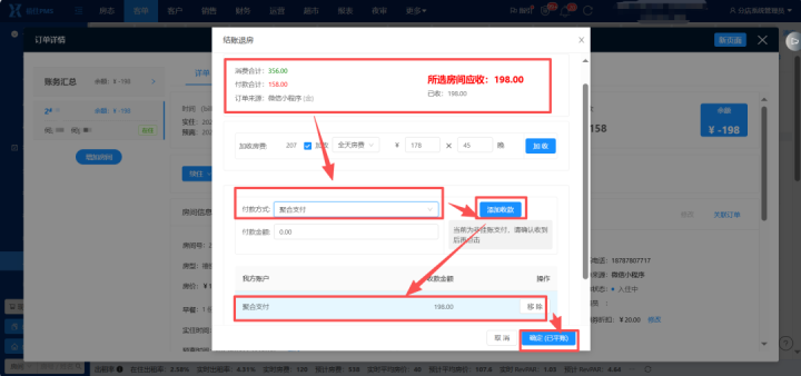 结账退房--证实生成--加收/不加收房费(凭证内容情况接纳)--付款样子接纳“团聚支付”--点击“添加收款”--“确定”