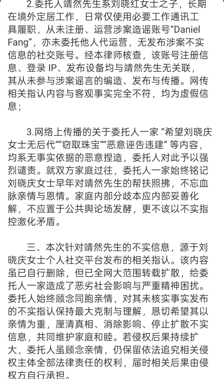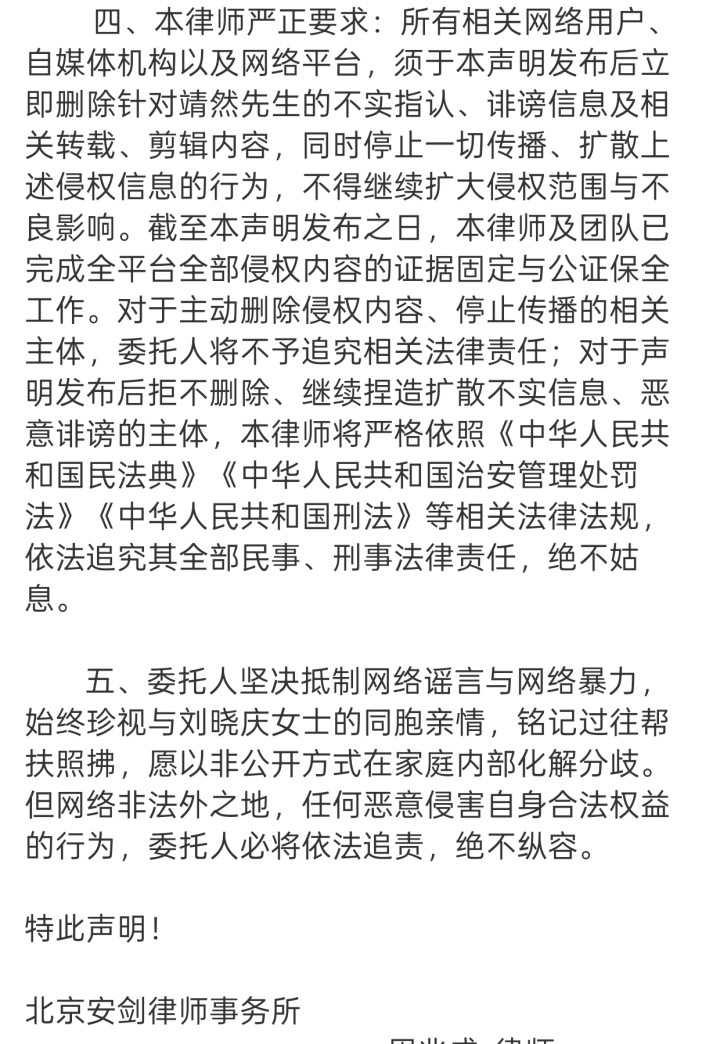 3月26日,刘晓庆公开叱咤外甥靖然盼着我方短折,念念要吃我方绝户后,靖然平直请了讼师,发布讼师函复兴刘晓庆,面上说着感德,可字字句句都是对刘晓庆的指责。