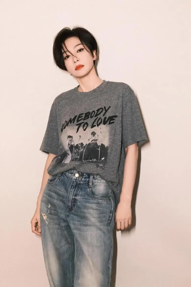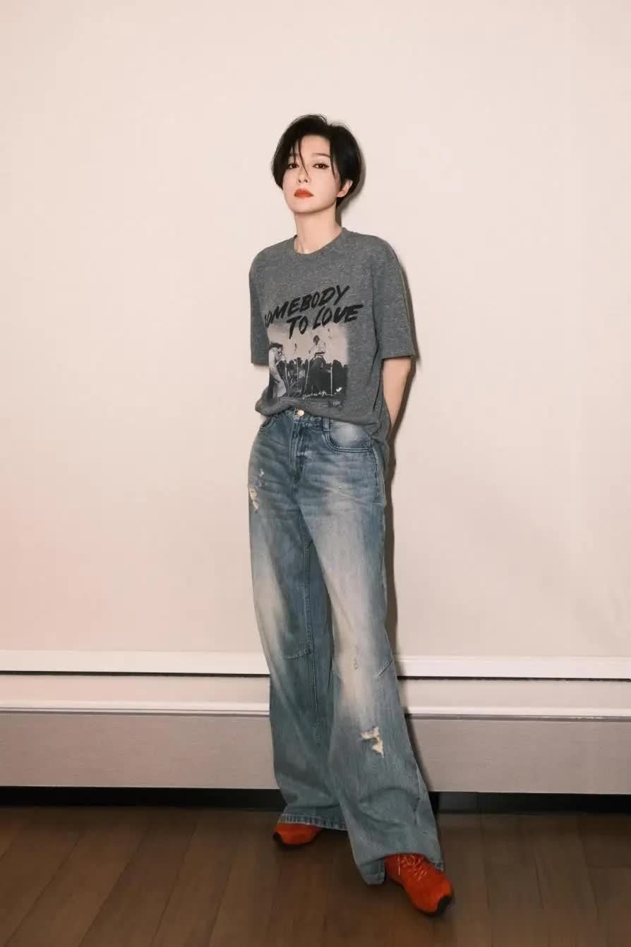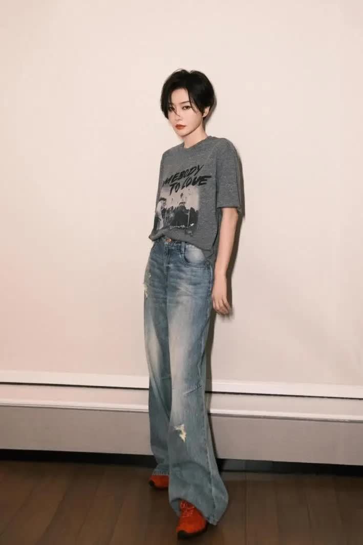 终末这身搭配中,秦岚选拔灰色t恤搭配蓝色牛仔裤和红色引导鞋,配色复旧又斯文。上半身用一件深灰色印花t恤突显失业感,胸前印花图案自带复旧滤镜。下装搭配一条作念旧水洗牛仔裤,裤腿破洞与渐变蓝调让基础款颇具故事感。穿戴时,秦岚通过塞衣角技巧拉高腰线,显得腿越过长,比例很棒。