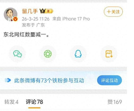 一位名为“留几手”的网红,在我方的账号上发布了一条仅有八个字的动态:东北网红数目减一!