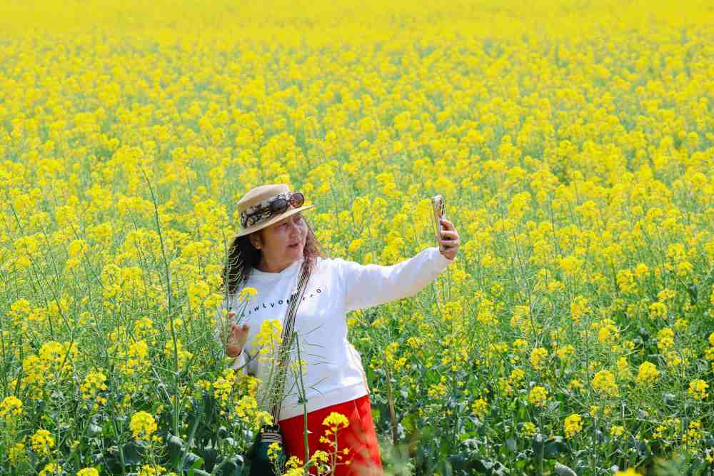 游客在罗平县油菜花海里拍照打卡。新华社记者熊轩昂 摄